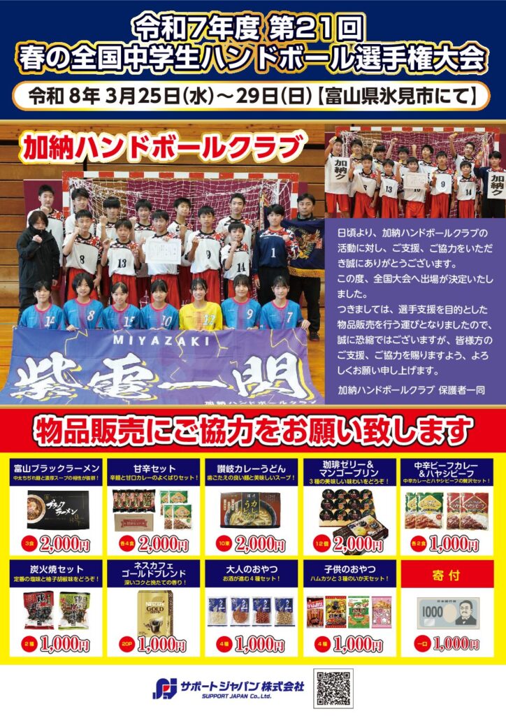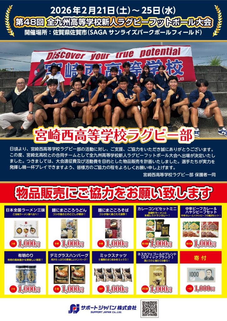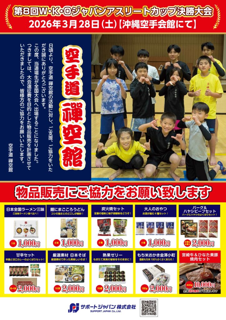 こんなことで\困っていませんか?/ お子さんの活動費や資金作りに困ってしまうのは、あなただけではありません こういったスポーツなどの活動費をまかなうための資金づくりのやり方は大きく5つありますそれは・・このような5つの方法です 資金作りの5つの方法 とはいえ、それぞれのやり方にはメリットやデメリットも存在します 5つの資金作りメリット&デメリット これらのポイントをまとめると・・地元で頑張る子ども達を応援するための資金作りの方法でおススメなのは“物品販売”なんです! 物品販売応援団5つの強み 01一人一人に合わせた的確なアドバイス 目標資金の設定,お客様の状況に合わせた販売しやすい商品の紹介,実際に販売するまでの流れや販売の際に必要な資料のフォーマットの配布やアドバイスなどをいたします 02 無料で使えるオリジナルチラシなどのプレゼント 特に利用される方の多いオリジナルチラシの作成、ご案内状、 お礼状のフォーマット等無料でプレゼントしております。 03 SNS 活用方法を伝授! LINE や Facebook などのチャットツールや SNS を利用したお知らせの流し方、 より早く目標へ到達するためのアドバイスもしております。 04 物品販売初心者にも安心のサポート 実際に物品販売にご協力頂く保護者の方々はセールスや販売の経験がなく、 不安に思う方も少なくありません。 そんな方でも販売しやすいお知らせの流し方,伝え方のアドバイスもしております。 05 売れ残りの不安一切なし 事前に購入される方の集計を受けてから納品しますので、 売れた分だけお知らせください!売れ残りは作らせません。 安心しておまかせください! 物品販売をつかった活動の流れ パンフレットから販売したい商品数点と目標利益金額を決めます 既存のチラシまたは団体のオリジナルチラシを選んでいただきそのチラシを持って地域の家庭やご親戚・会社に協力を募ります 注文が集まりましたらご集計いただき、当社専用の注文用紙で FAX にてご注文下さい 商品の到着。協力してくださった方に商品を渡し、代金を集金します。 商品到着時、同梱している請求書を確認し、 指定の銀行に払い込みます。 目標金額に達成すると活動資金としてご活用いただけます! 初めて物品販売する人にもわかりやすい価格設定 サポートジャパンの”厳選商品”ピックアップ 1,000円商品 もっと見る 讃岐うどん 8束辛辛セットミニ兼六の彩 2,000円商品 もっと見る カレーコンビセット丸亀釜あげうどん 有明のり4本セット 3,000円商品 もっと見る 島原手延べ素麺40束味セレクトマンゴードリンク20缶入り 物品販売サポート団体一覧 大会出場おめでとうございます!黒木桂悟2026年1月30日カテゴリー3(0) Read More大会出場おめでとうございます!黒木桂悟2026年1月30日カテゴリー3(0) Read More大会出場おめでとうございます!黒木桂悟2026年1月30日カテゴリー3(0) Read More大会出場おめでとうございます!黒木桂悟2026年1月30日カテゴリー3(0) Read More大会出場おめでとうございます!黒木桂悟2026年1月29日カテゴリー3(0) Read More大会出場おめでとうございます!黒木桂悟2026年1月8日カテゴリー3(0) Read More お客さまの声 2021年2月18日...Read More2021年2月17日...Read More2021年2月17日...Read More2021年2月17日...Read More お問い合わせ 必須ご氏名 必須メールアドレス ※お問い合わせ・ご相談へのご回答の受信アドレスをご記載ください。迷惑メールブロック機能やPCメールの受信拒否設定をご利用の場合は、support-jpn.comドメインからのメールを受信可能にしてください(ezwebの迷惑メールフィルターなどによって返信メールをお届けできない事例が発生しています) 必須電話番号 必須お問い合わせ内容 スパムメール防止のため、こちらのボックスにチェックを入れてから送信してください。 Δ プロフィール サポートジャパン株式会社 代表取締役 黒木桂悟(クロギケイゴ) 宮崎県児湯郡都農町出身。剣道12年(都農剣友会、都農中、都城東高校、宮崎産業経営大学)、柔道2年(都農柔道)、ラグビー12年(宮崎産業経営大学、都農クラブ)、アームレスリング12年(宮崎県アームレスリング連盟)、キックボクシング(正道会館)2年、空手(正道会館)16年。たくさんのスポーツに関わってきました。娘たち3人も空手(律道会館)を経験しており、多数の大会で入賞をしてきました。のちに、3人ともバレーボールに転向し活躍しました。スポーツ好きが講じ、スポーツする人たちを応援したい気持ちから事業を始めました。 【空手戦歴】H17/7/24正道会館西日本空手道選手権大会グローブカラテクラス重量級準優勝H19/7/1正道会館全関西空手道選手権大会マスターズクラス重量級優勝H19/11/4正道会館全九州空手道選手権大会マスターズクラス優勝H21/7/12正道会館全関西空手道選手権大会マスターズAクラス無差別級準優勝H21/11/1正道会館全九州空手道選手権大会マスターズAクラス優勝H24/6/3白蓮会館全九州空手道選手権大会壮年の部重量級優勝H25/6/16白蓮会館全九州空手道選手権大会壮年の部優勝H26/4/12正道会館ウェ