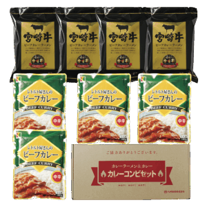 シェフ厳選のカレー粉をベースに宮崎牛を使ったビーフカレーラーメンとレトルト屋さんのビーフカレーのセットです。