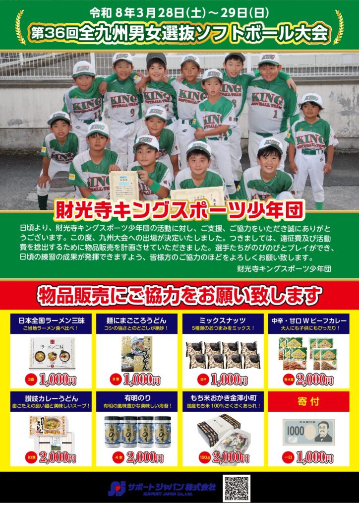 大会出場おめでとうございます!カテゴリー3 / コメントする / By 黒木桂悟 財光寺キングスポーツ少年団様 『第36回全九州男女選抜ソフトボール大会』 令和8年3月28日(土)~29日(日) 大会出場おめでとうございます!! 選手の皆様が日頃の練習の成果が発揮できますよう、微力ながら応援させていただきます!