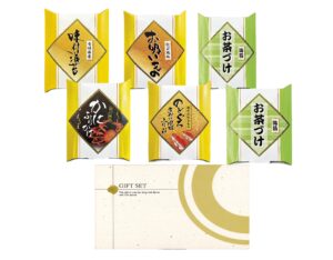 有明海の恵み豊かな香り高い海苔に永谷園のお茶づけ・お吸い物、かにふりかけ、のどぐろ煮つけ風味ふりかけを詰め合わせました。