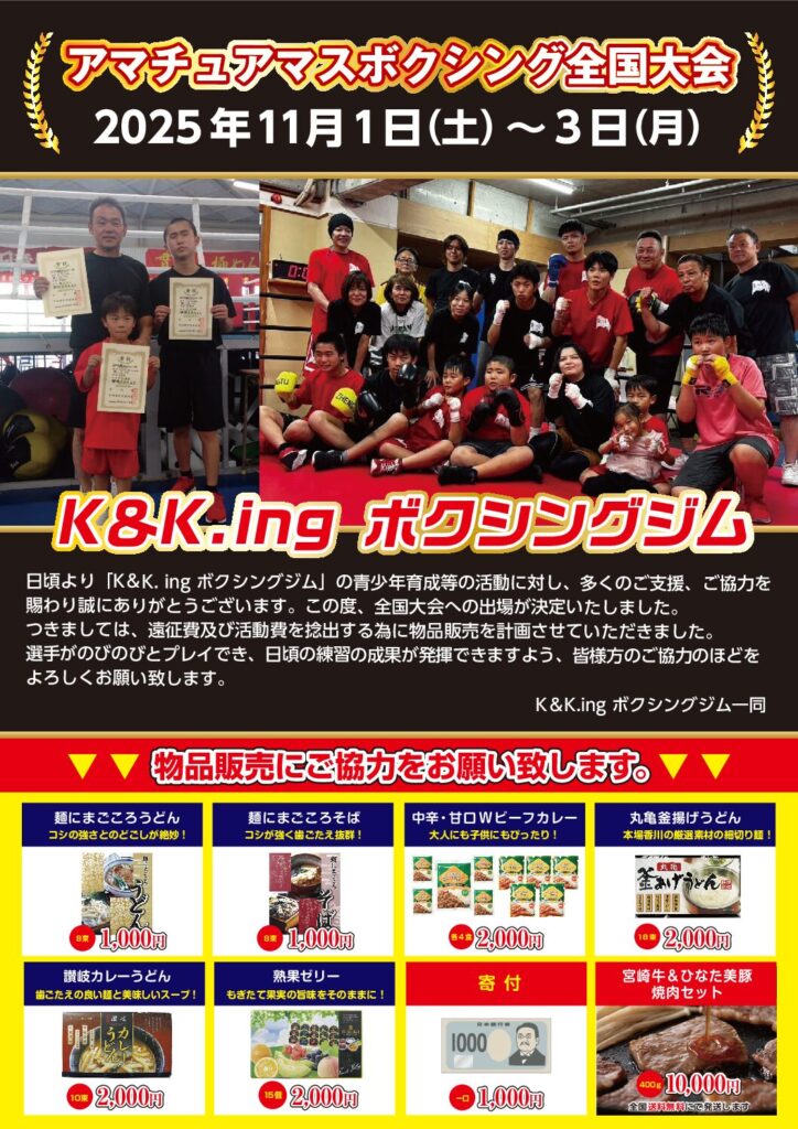 K&K.ing ボクシングジム様 『アマチュアマスボクシング全国大会』 2025年11月1日(土)~3日(月)開催 全国大会出場おめでとうございます! 選手の皆様が日頃の練習の成果を発揮できますよう、微力ながら応援させて