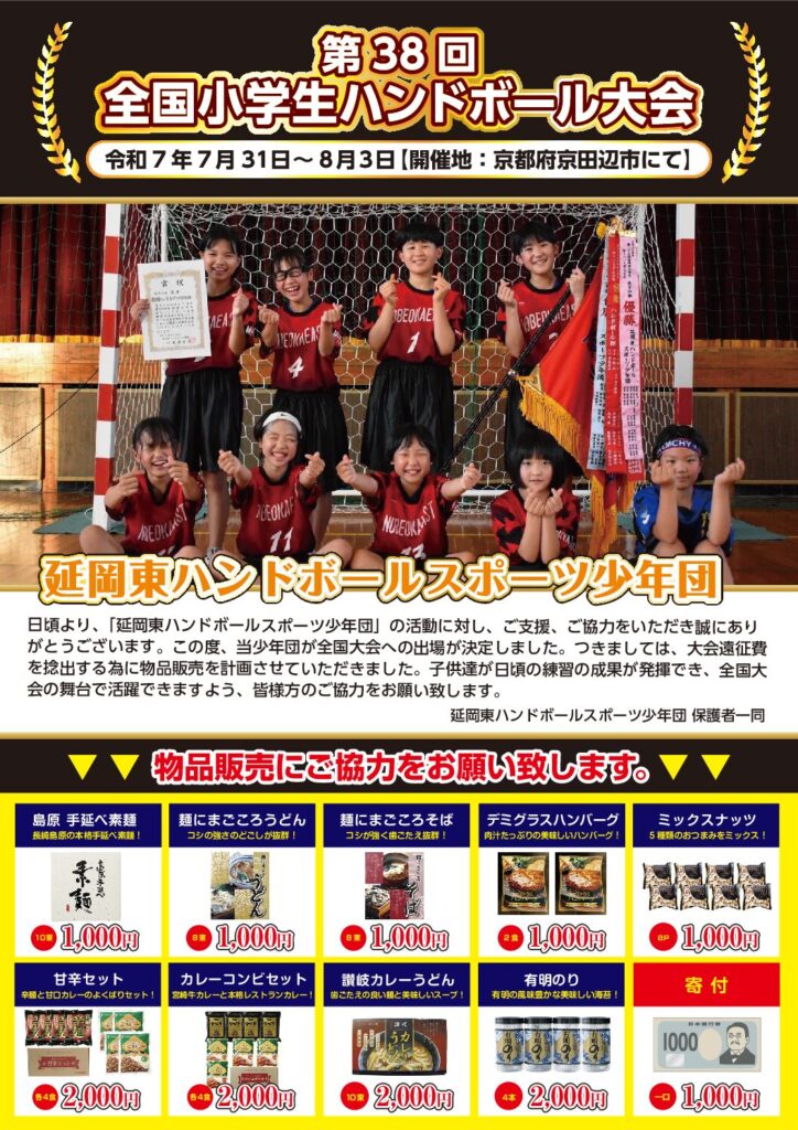 延岡東ハンドボールスポーツ少年団様 『第38回 全国小学生ハンドボール大会』 令和7年7月31日~8月3日 京都府京田辺市にて 全国大会出場おめでとうございます! お子様たちが日頃の練習の成果が発揮でき、のびのびとプレー