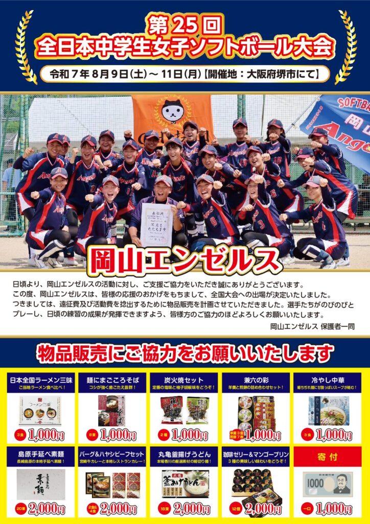 岡山エンゼルス様 『第25回 全日本中学生女子ソフトボール大会』 令和7年8月9日(土)~11日(月) 大阪府堺市にて 全国大会出場おめでとうございます! 選手の皆様が日頃の練習の成果が発揮でき、のびのびとプレーできます