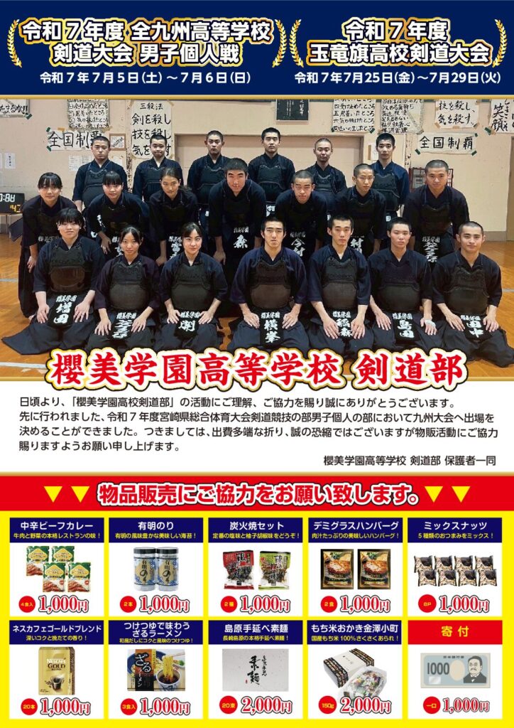 櫻美学園高等学校 剣道部 『令和7年度 全九州高等学校剣道大会 男子個人戦』 令和7年7月5日(土)~7月6日(日) 『令和7年度 玉竜旗高校剣道大会』 令和7年7月25日(金)~7月29日(火) 九州大会出場おめでとう