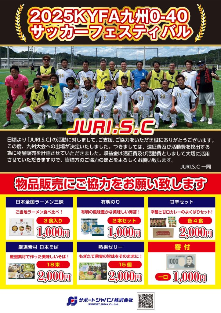 JURI.S.C様 『2025KYFA九州0-40 サッカーフェスティバル』 九州大会出場おめでとうございます! 選手の皆様が日頃の練習の成果を発揮できますよう、微力ながら応援させていただきます! 応援チラシはこちら⇒J