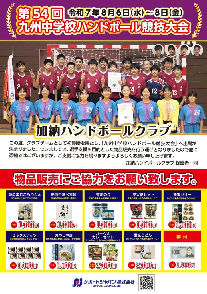 加納ハンドボールクラブ様 『第54回 九州中学校ハンドボール競技大会』 令和7年8月6日(水)~8日(金) 大会出場おめでとうございます! 選手の皆様が日頃の練習の成果が発揮でき、のびのびとプレーできますよう、微力ながら