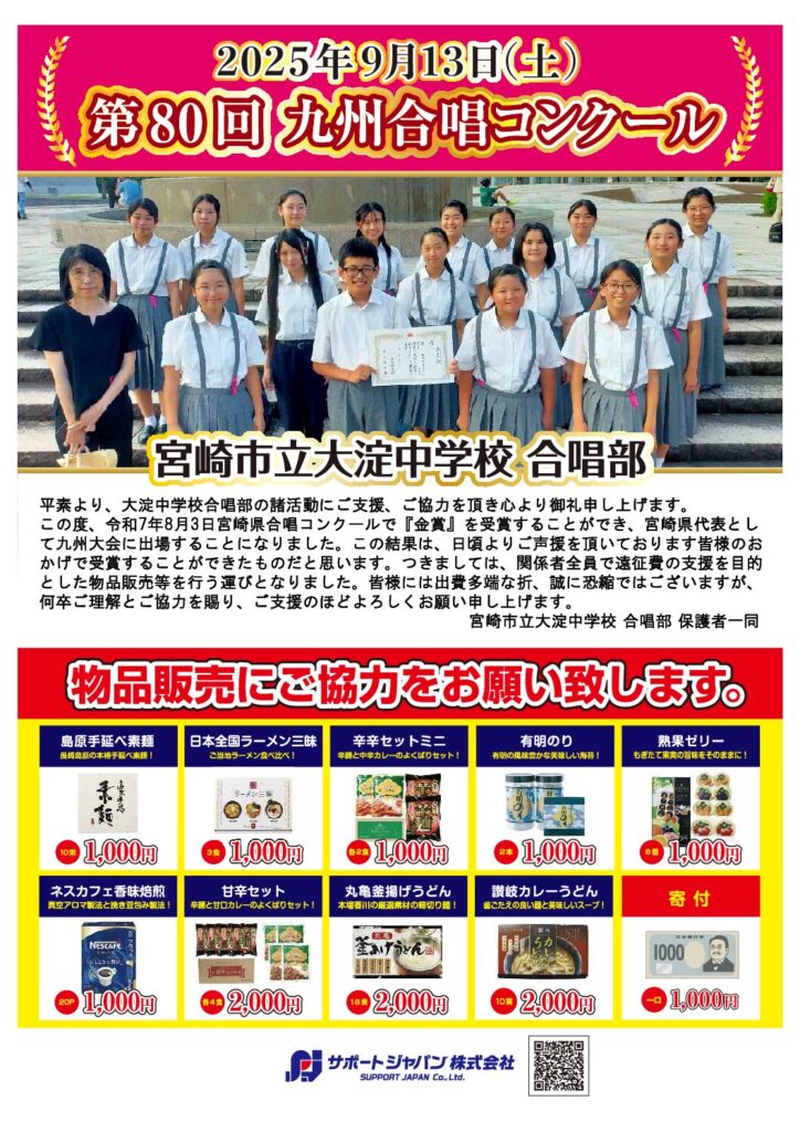 宮崎市立大淀中学校合唱部様 『第80回 九州合唱コンクール』 2025年9月13日(土) 大会出場おめでとうございます! 部員の皆様が日頃の練習の成果が発揮できますよう、微力ながら応援させていただきます! 応援チラシはこ
