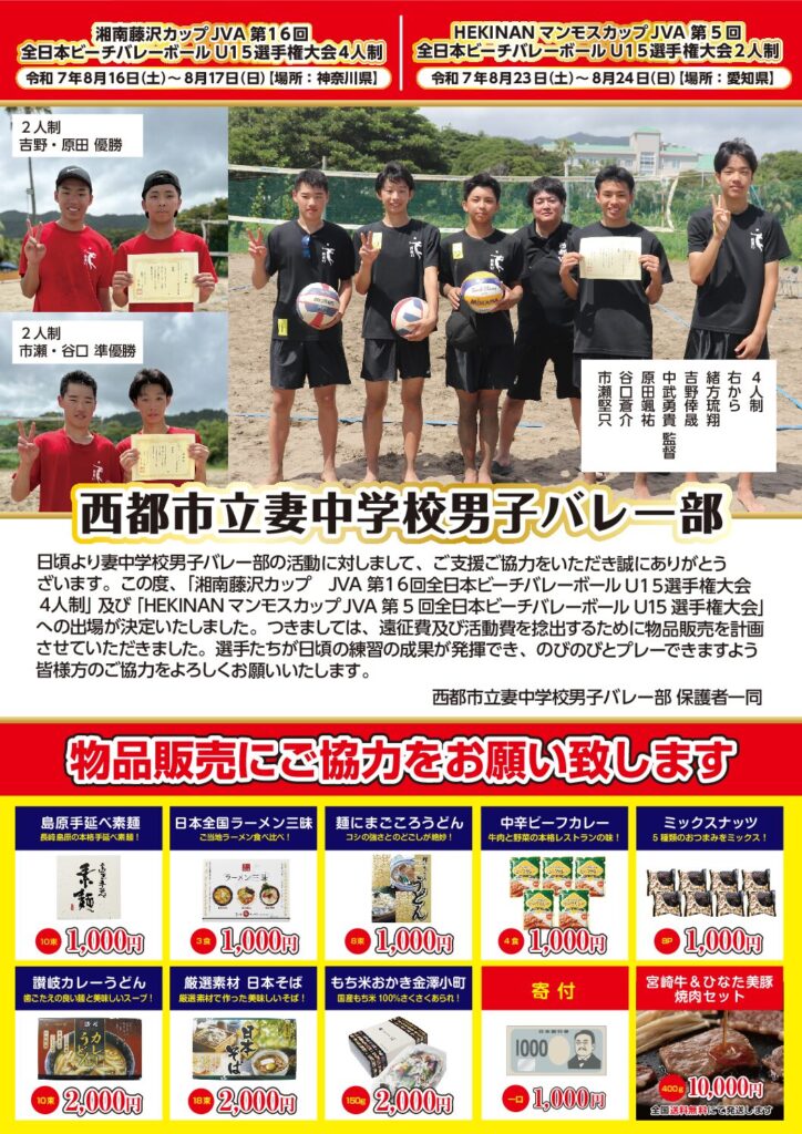 西都市立妻中学校男子バレー部様 『湘南藤沢カップJVA 第16回全日本ビーチバレーボールU15選手権大会4人制』 令和7年8月16日(土)~8月17日(日) 神奈川県にて 『HEKINANマンモスカップJVA 第5回全日