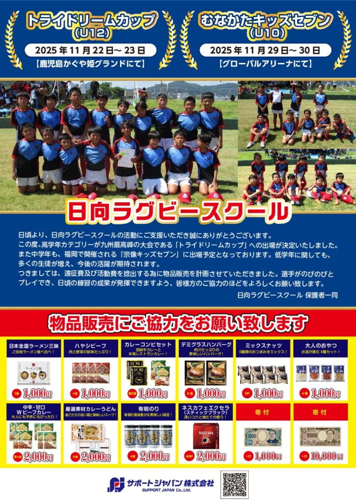 日向ラグビースクール様 『トライドリームカップ(U12)』 2025年11月22日~23日 鹿児島かぐや姫グランドにて 『むなかたキッズセブン(U10)』 2025年11月29日~30日 グローバルアリーナにて 大会出場 […]