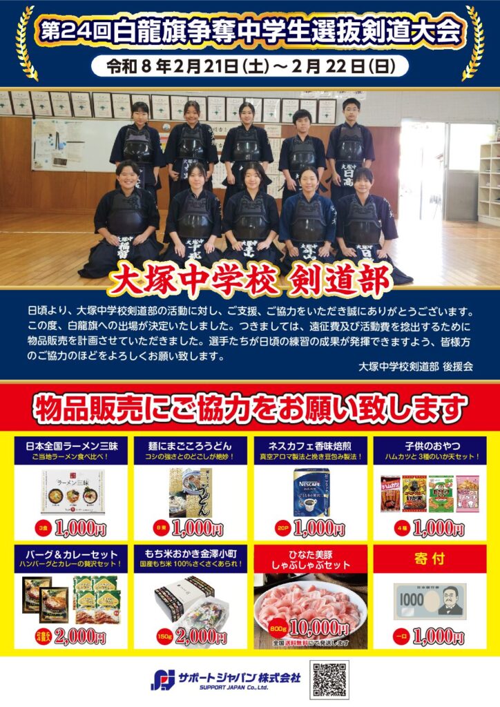 大塚中学校 剣道部様 『第24回 白龍旗争奪中学生選抜剣道大会』 令和8年2月21日(土)~2月22日(日) 大会出場おめでとうございます!! 選手の皆様が日頃の練習の成果が発揮できますよう、微力ながら応援させていただき […]