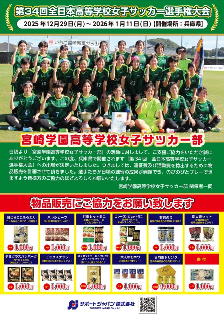 宮崎学園高等学校女子サッカー部様 『第34回全日本高等学校女子サッカー選手権大会』 2025年12月29日(月)~2026年1月11日(日) 兵庫県にて 全国大会出場おめでとうございます!! 選手の皆様が日頃の練習の成果