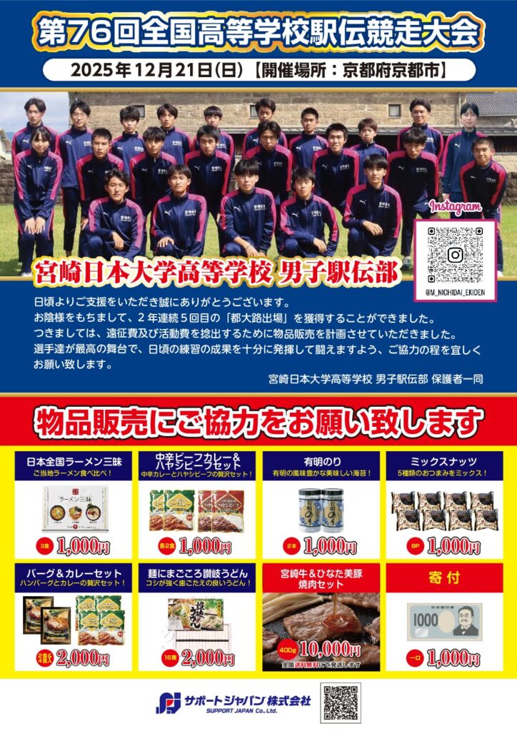 宮崎日本大学高等学校 男子駅伝部様 『第76回全国高等学校駅伝競走大会』 2025年12月21日(日) 京都府京都市にて 全国大会出場おめでとうございます!! 選手の皆様が日頃の練習の成果を発揮できますよう、微力ながら応