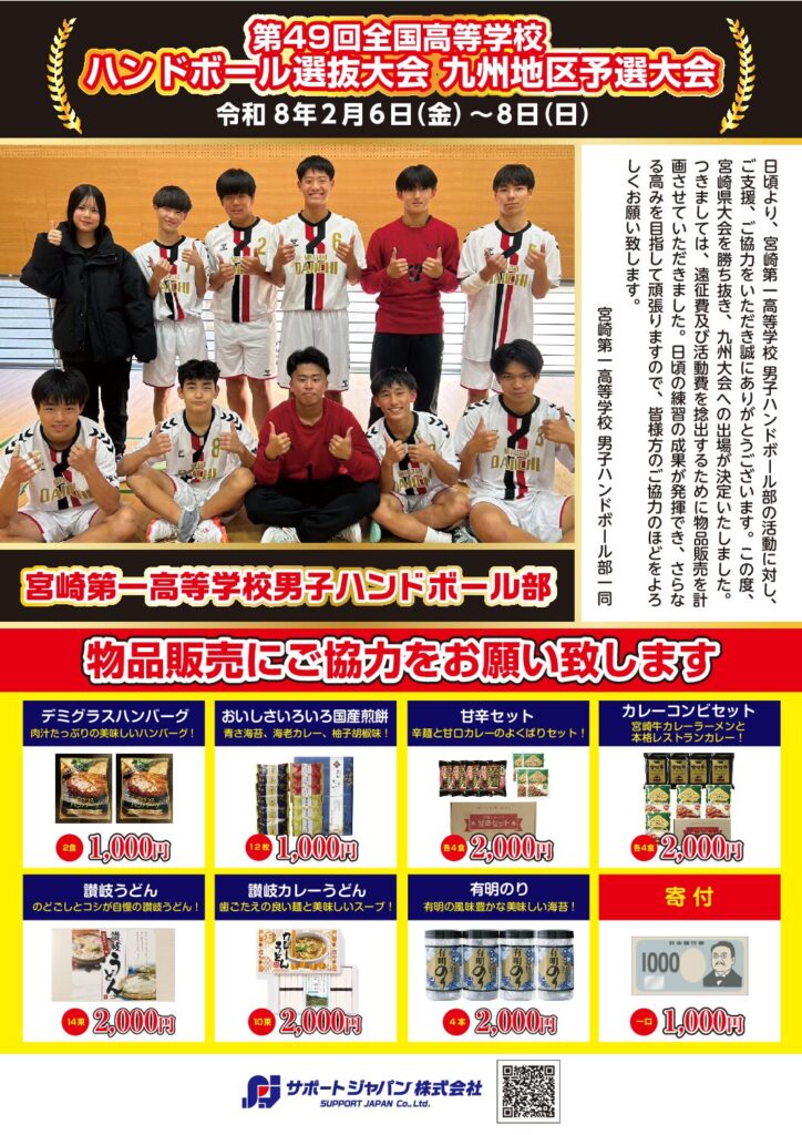 宮崎第一高等学校男子ハンドボール部様 『第49回全国高等学校ハンドボール選抜大会 九州地区予選大会』 令和8年2月6日(金)~8日(日) 大会出場おめでとうございます!! 選手の皆様が日頃の練習の成果が発揮できますよう、